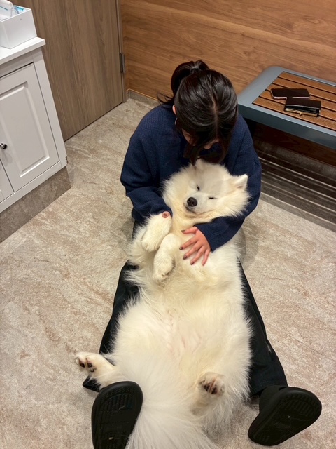 別の日のお出かけで訪れたのは、ずっと気になっていたサモエドドッグカフェ「Samoyed Cafe Park」。扉を開けた瞬間、目に飛び込んでくるのは真っ白でふわふわのサモエド犬たち。人懐っこくて穏やかな性格の子たちが、こちらを見てにこっと笑ってくれるだけで、自然と気持ちが和らぎます。ふかふかの毛並みに触れながら過ごす時間は、まさに至福のひととき。忙しい日常ではなかなか味わえない、何も考えず「かわいい」に集中できる時間が、心をしっかり癒してくれました。犬好きの方はもちろん、ちょっと疲れた時にもおすすめしたいスポットです。